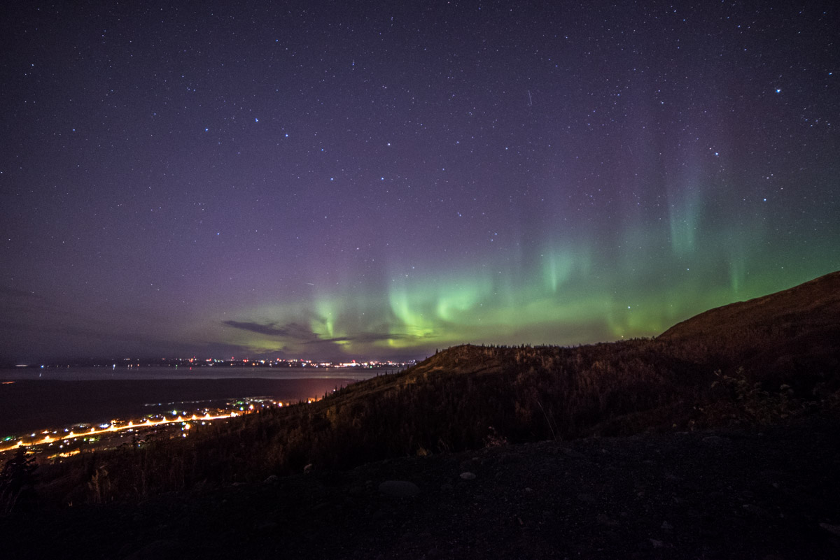 Die Nordlichter bewundern wir vom Skyline Drive in Eagle River, ein beliebter Spot der Einheimischen, wie wir bald merken, denn je später es wird, umso mehr Autos trudeln hier ein. Und eine riesen Show legen die Nordlichter ein. Bei weitem zwar nicht so hell und klar wie am Dempster Highway, allerdings sehen wir sie tanzen – und das mit freiem Auge. Wir bleiben gleich über Nacht hier oben am Gipfel und fahren nach einem Stop beim Baumarkt zu unserem Campingplatz für die nächsten Nächte.