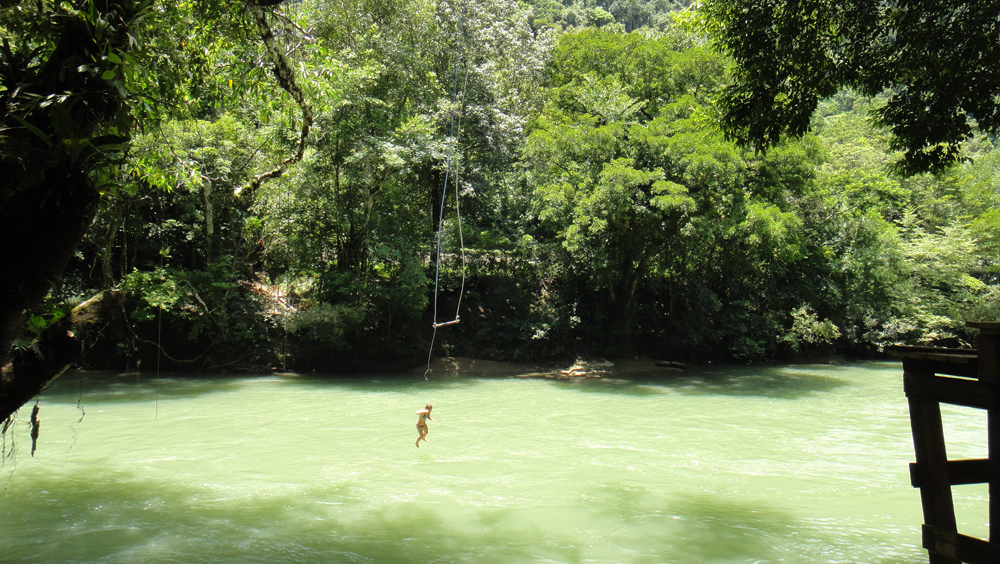 Heil kamen wir alle ca. 2 Stunden später wieder am Tageslicht an und schon ging es zum nächsten Spektakel. Eine Schaukel auf den Cahabon Fluss hinaus.
