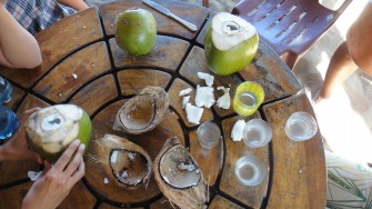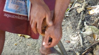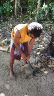 Der Profi am Werk, rechts zu sehen unser Kokosnus-Gemetzel.